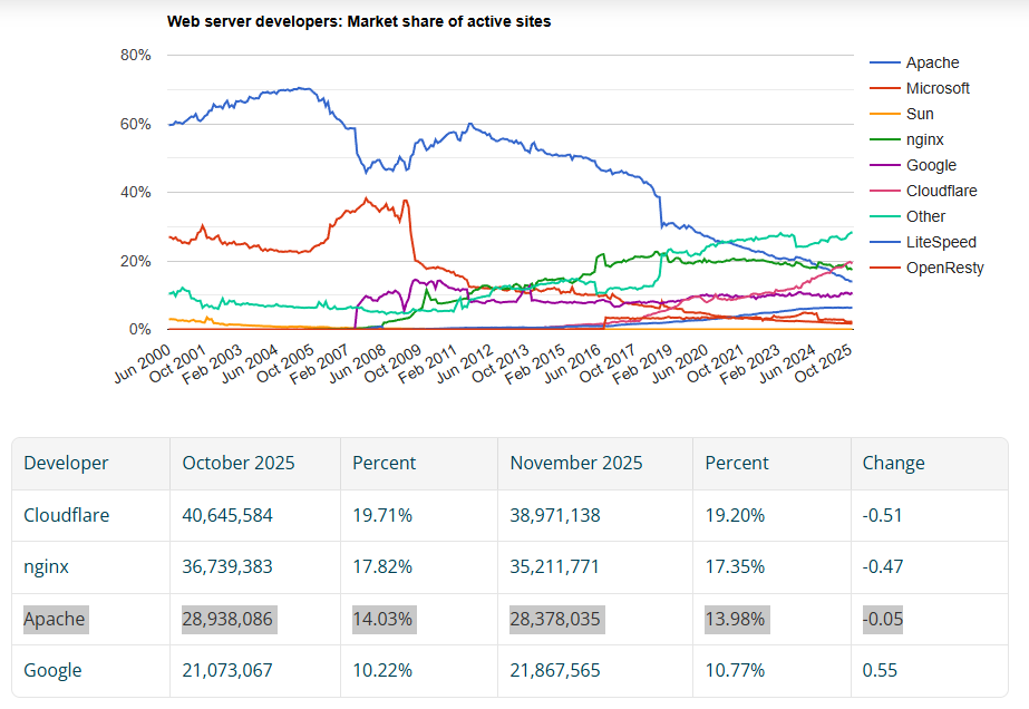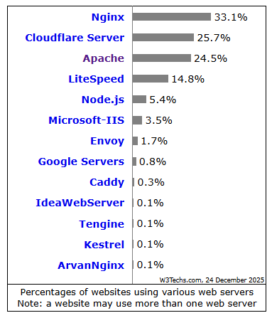 전세계 웹서버 시장의 약 45%를 차지하는 가장 범용적인 웹서버 제품으로서, 대규모 웹사이트를 지원합니다.